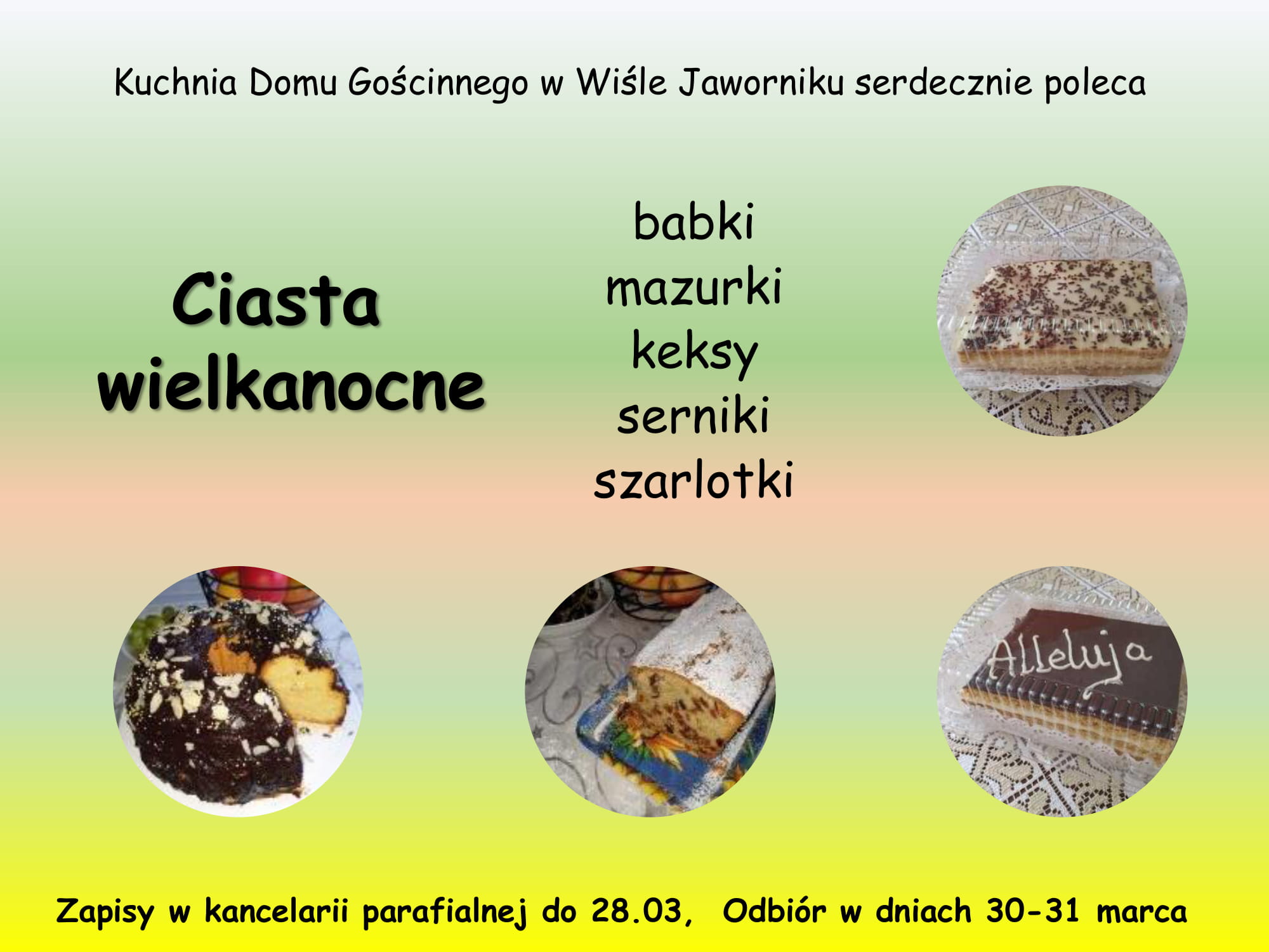 Kuchnia Domu Gościnnego poleca pyszne wielkanocne ciasta. Zamówienia można składać w kancelarii do 28 marca. Odbiór ciast będzie w dniach 30-31 marca.