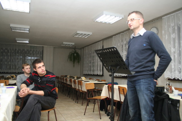 Opowiadał o tym, że strach jest nie tylko uczuciem, ale ogromną siłą duchową, za którą stoi król wszelkich strachów- szatan. Nasz przeciwnik chce niszczyć naszą wiarę, zasiewając niepokój i zwątpienie w Bożą moc. Na podstawie historii biblijnych ze Starego Testamentu mogliśmy się przekonać, jak na wielkich mężów Bożych oddziaływał w ten sposób, doprowadzając do zwątpienia w Boże obietnice, co z kolei zawsze wiązało się z konsekwencjami. Tak samo dzieje się i dziś w naszym życiu. Pozwalając lękowi na zdominowanie naszego życia, dajemy się zwodzić szatanowi, sami narażając się na porażki. Jak tego uniknąć? Gość spotkania przekonywał, iż musimy przeciwstawić się obawom wiarą i zaufaniem Panu Bogu, dając się mu prowadzić jak dziecko trzymające się ręki rodzica. On nie chce, abyśmy żyli w strachu i bojaźni przed spotykającymi nas w życiu doświadczeniami, ale daje nam ducha do walki z nimi. Przy tej okazji przypomnieliśmy sobie bardzo ważny werset: „Albowiem nie dał nam Bóg ducha bojaźni, lecz mocy i miłości, i powściągliwości.” (2 Tym. ; 1,7).