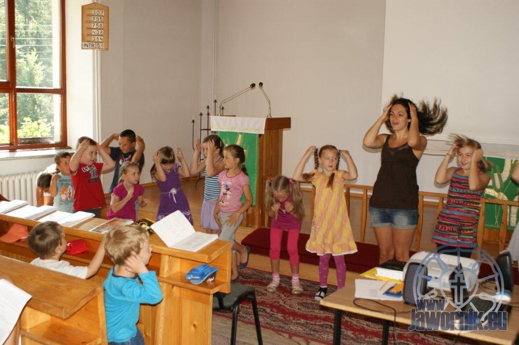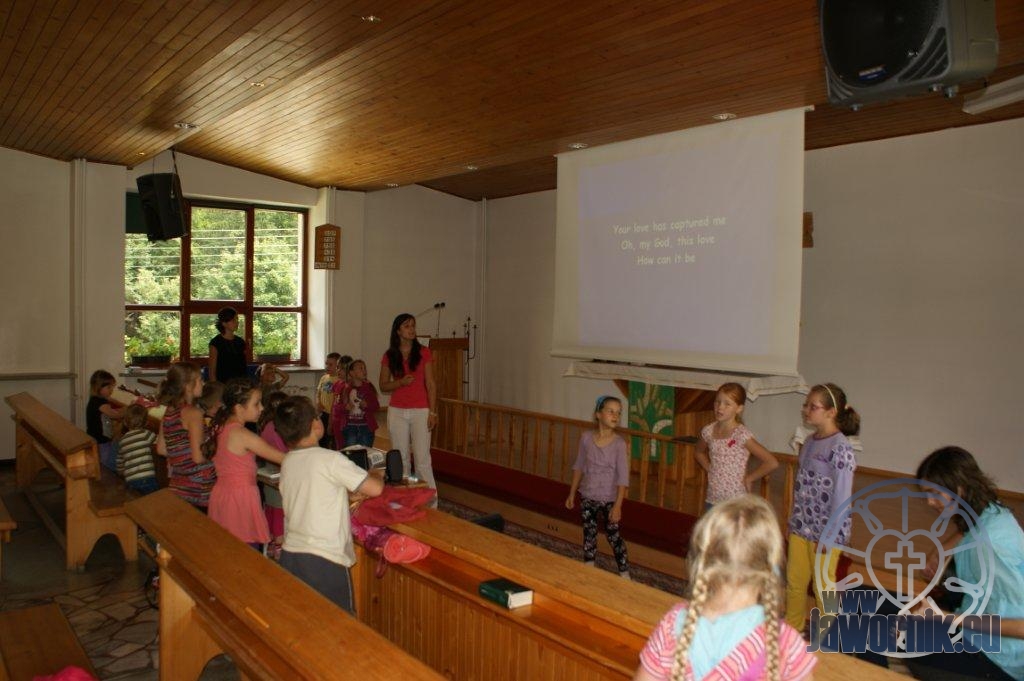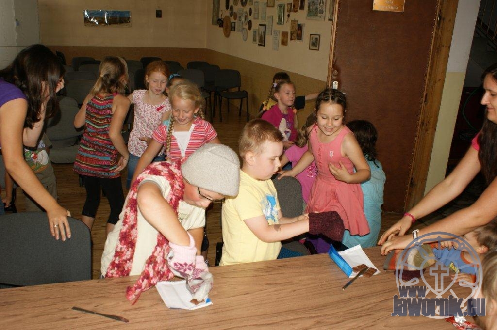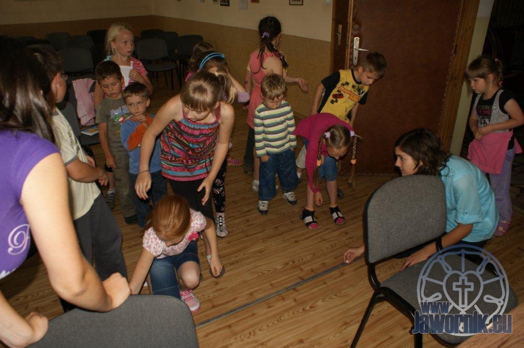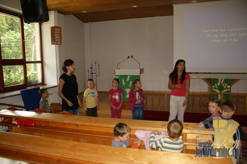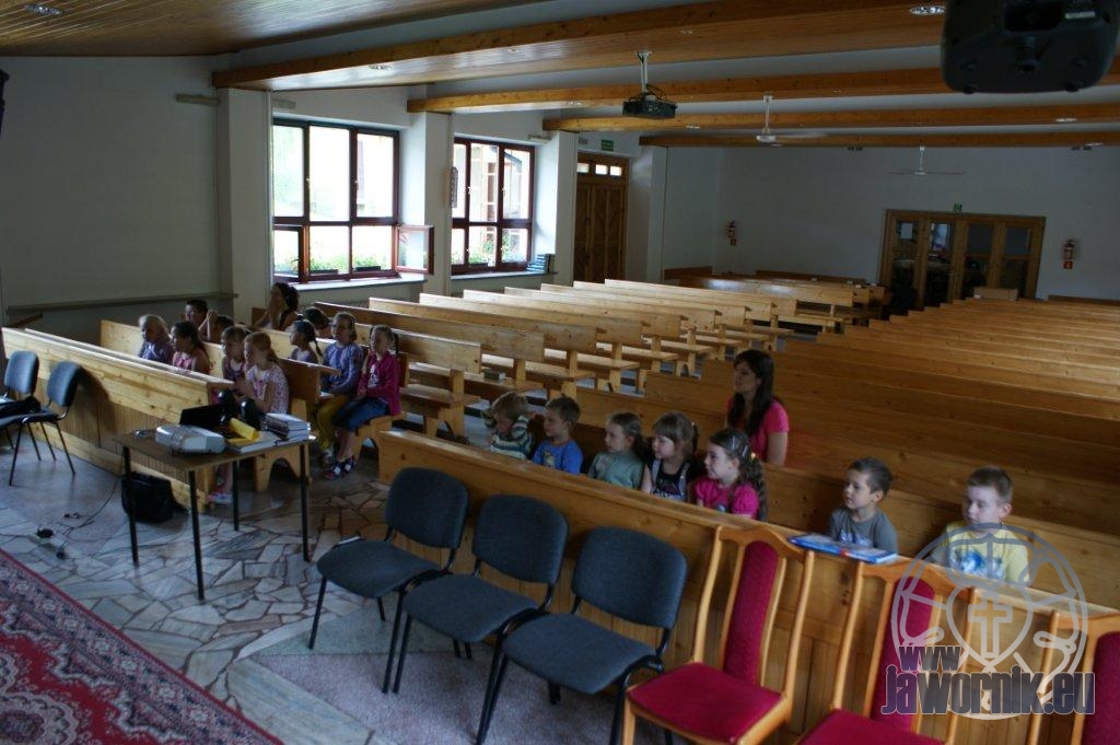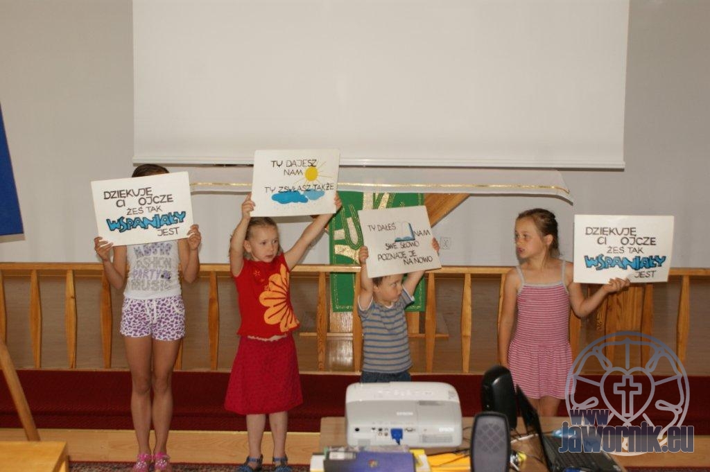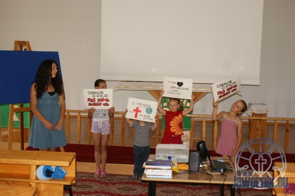 Zaczynaliśmy od wspólnego śpiewu szkółkowych piosenek. Poznaliśmy także kilka piosenek w języku angielskim. Kolejnym punktem programu była lekcja biblijna. Dzieci miały okazję nauczyć się nowych słówek, które były przewodnimi z każdej historii biblijnej. Staraliśmy się urozmaicić zajęcia i zainteresować drogich milusińskich, w szczególności tych najbardziej wymagających- najmłodszych? Na zajęcia plastyczne i naukę wersetu dzieliliśmy się na grupę starszą i młodszą. Każdego dnia poznawaliśmy werset w języku angielskim, nawiązujący do uprzednio opowiadanej historii biblijnej. Następnie schodziliśmy do jadalni na małe co nieco. Po zaspokojeniu naszych żołądków nadchodził czas długo wyczekiwany przez dzieciaki. Nie trudno się domyśleć, że chodzi o zabawy i konkursy, w których dominowała zacięta walka o zwycięstwo. Wszystko skupiało się wokół Pana Jezusa, który zarówno w języku polskim jak i angielskim jest uosobieniem niezmierzonej miłości. Zwieńczeniem całotygodniowych spotkań było niedzielne nabożeństwo, na którym dzieci miały okazję zaprezentować dwie piosenki w języku angielskim. Jako opiekunowie tegorocznej półkolonii bardzo miło będziemy wspominać czas spędzony razem i mamy nadzieję, że z Bożą pomocą spotkamy się i za rok!