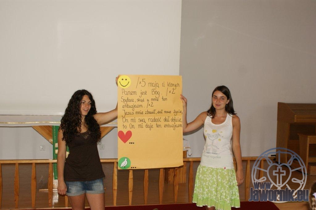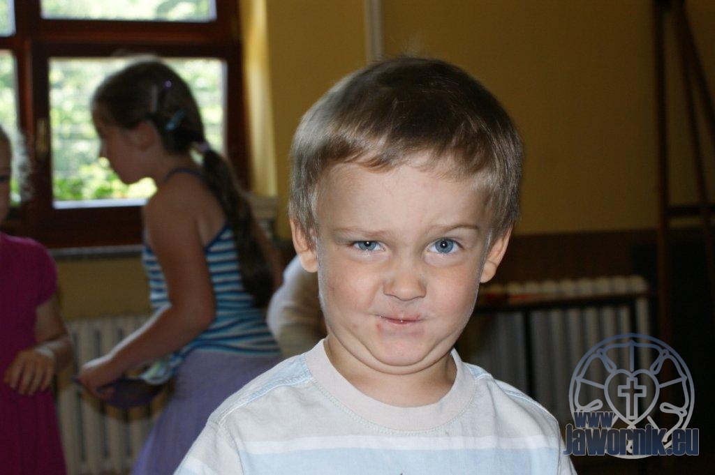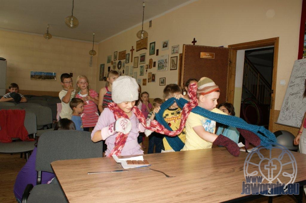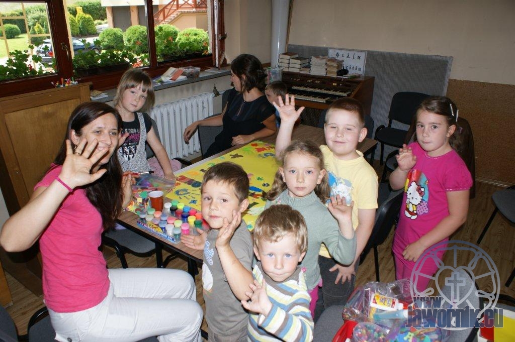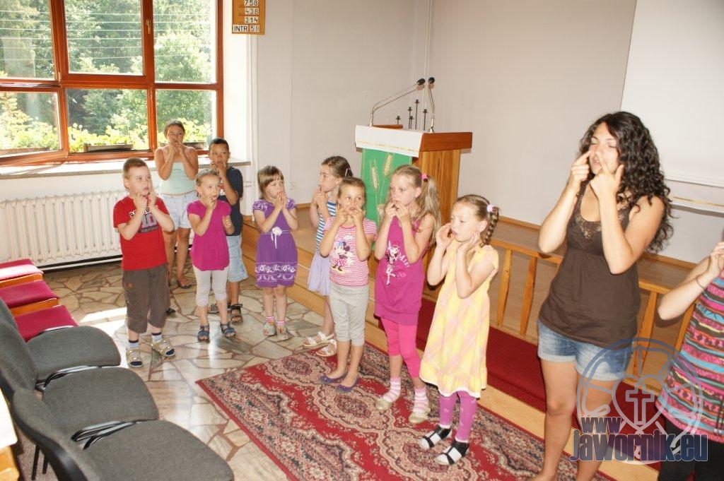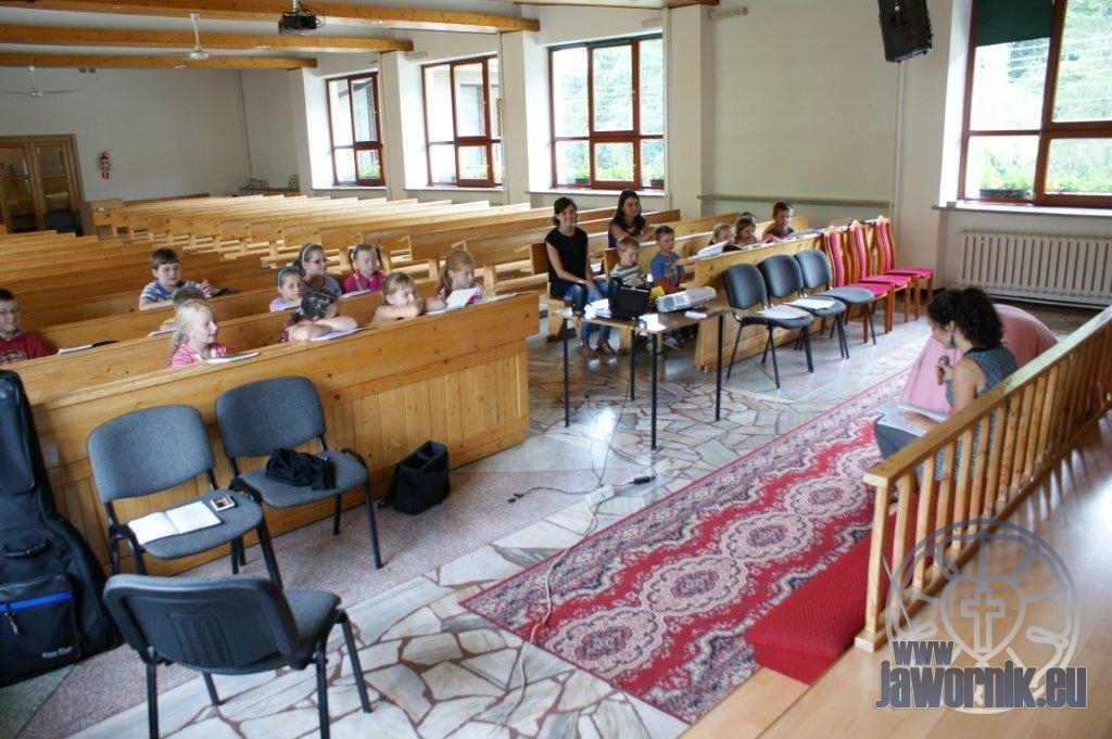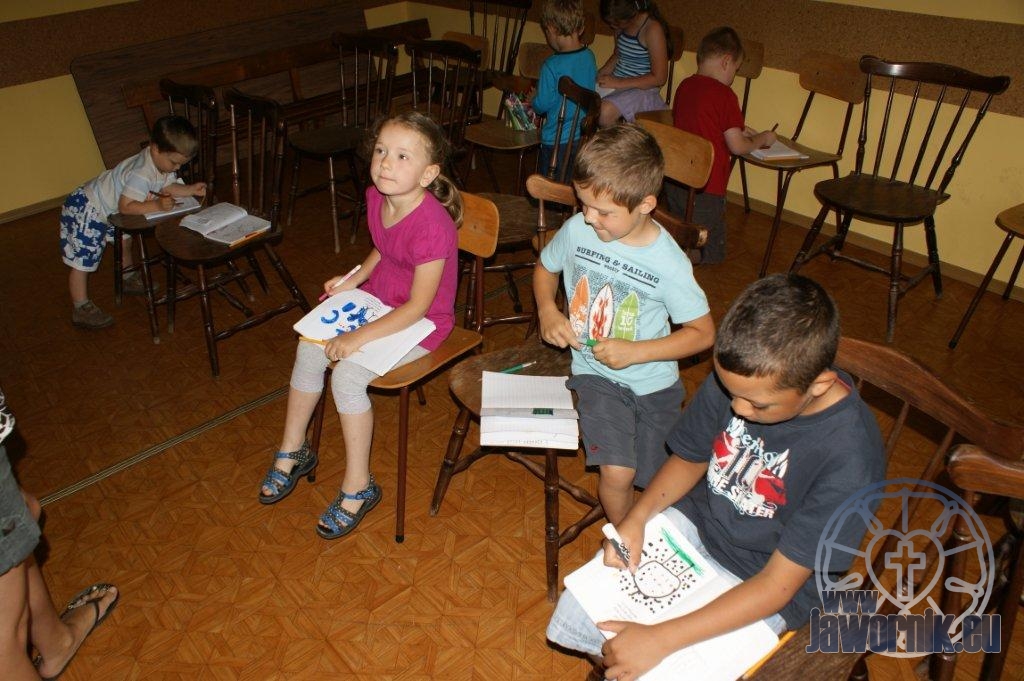 Zaczynaliśmy od wspólnego śpiewu szkółkowych piosenek. Poznaliśmy także kilka piosenek w języku angielskim. Kolejnym punktem programu była lekcja biblijna. Dzieci miały okazję nauczyć się nowych słówek, które były przewodnimi z każdej historii biblijnej. Staraliśmy się urozmaicić zajęcia i zainteresować drogich milusińskich, w szczególności tych najbardziej wymagających- najmłodszych? Na zajęcia plastyczne i naukę wersetu dzieliliśmy się na grupę starszą i młodszą. Każdego dnia poznawaliśmy werset w języku angielskim, nawiązujący do uprzednio opowiadanej historii biblijnej. Następnie schodziliśmy do jadalni na małe co nieco. Po zaspokojeniu naszych żołądków nadchodził czas długo wyczekiwany przez dzieciaki. Nie trudno się domyśleć, że chodzi o zabawy i konkursy, w których dominowała zacięta walka o zwycięstwo. Wszystko skupiało się wokół Pana Jezusa, który zarówno w języku polskim jak i angielskim jest uosobieniem niezmierzonej miłości. Zwieńczeniem całotygodniowych spotkań było niedzielne nabożeństwo, na którym dzieci miały okazję zaprezentować dwie piosenki w języku angielskim. Jako opiekunowie tegorocznej półkolonii bardzo miło będziemy wspominać czas spędzony razem i mamy nadzieję, że z Bożą pomocą spotkamy się i za rok!