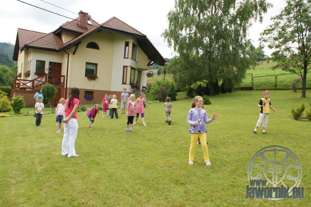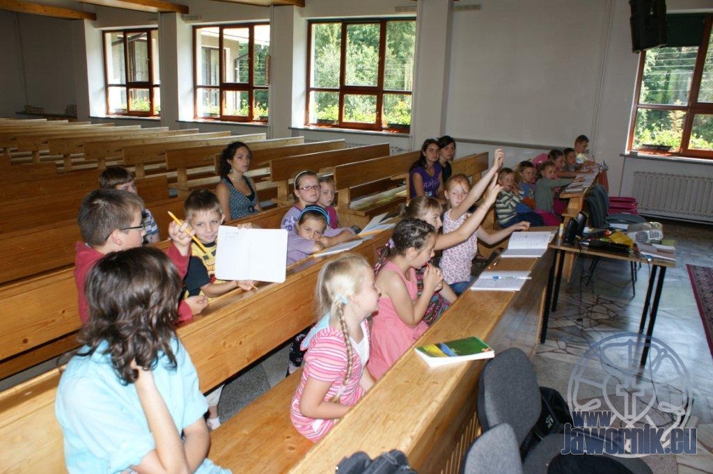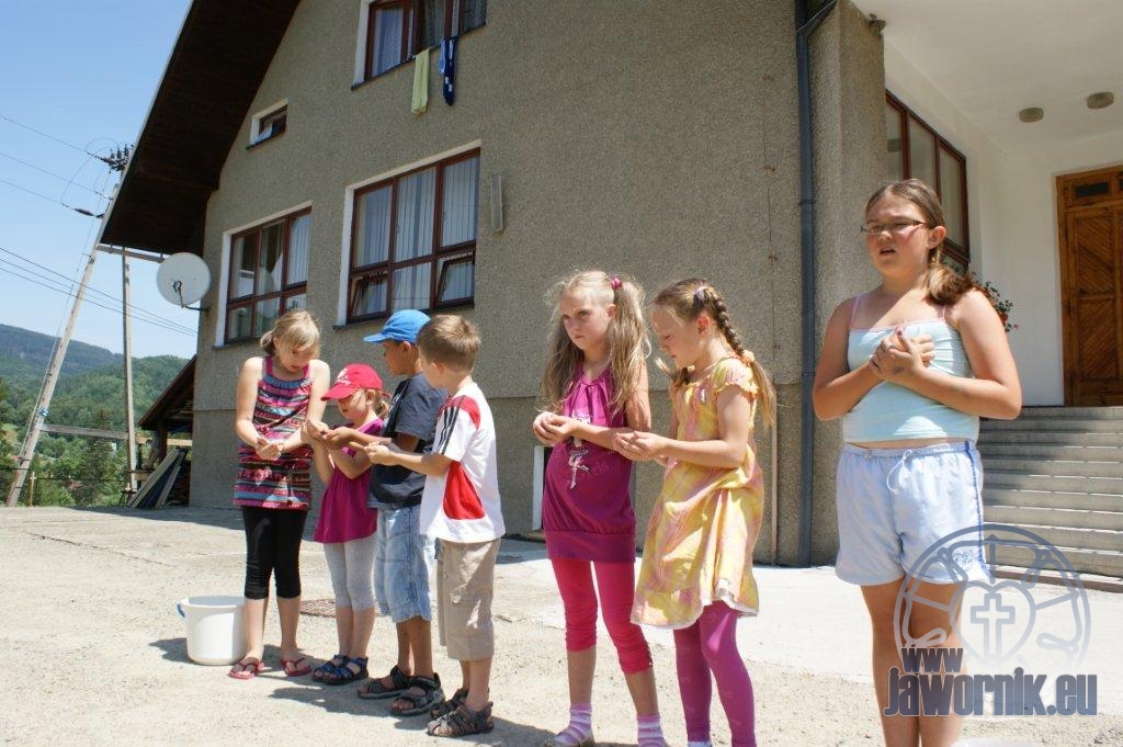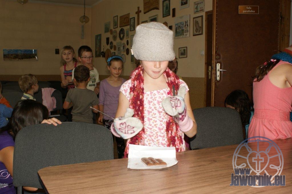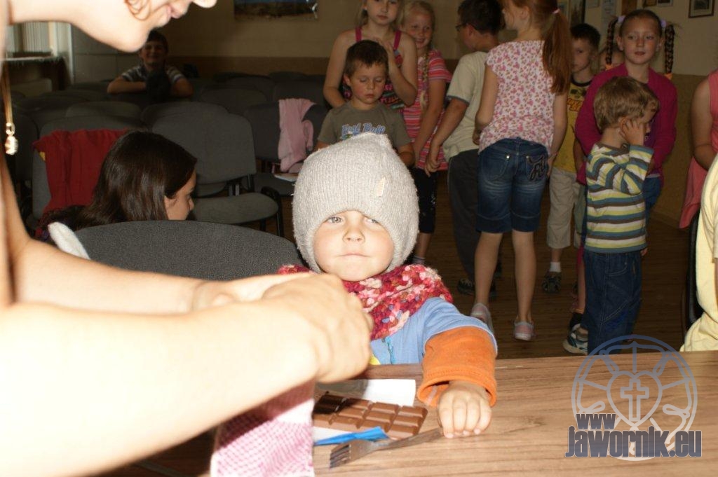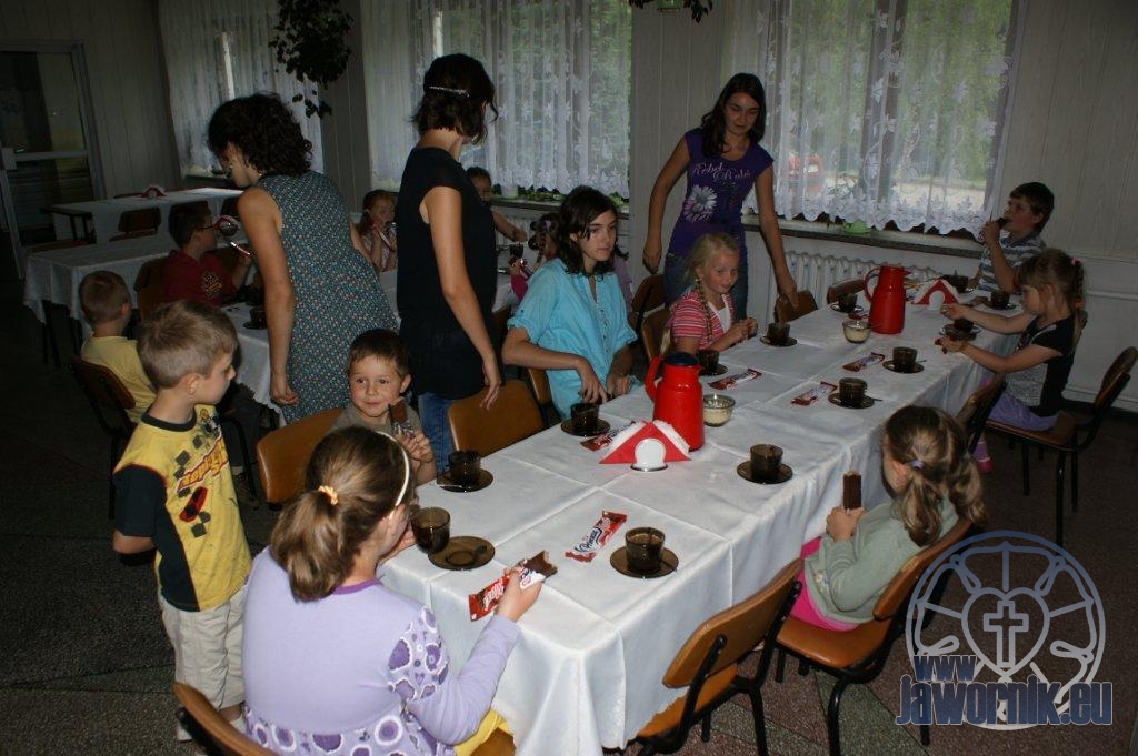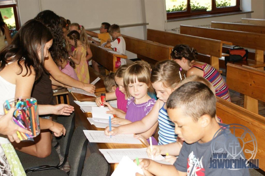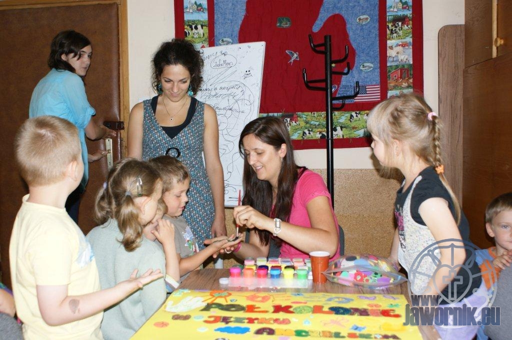 Zaczynaliśmy od wspólnego śpiewu szkółkowych piosenek. Poznaliśmy także kilka piosenek w języku angielskim. Kolejnym punktem programu była lekcja biblijna. Dzieci miały okazję nauczyć się nowych słówek, które były przewodnimi z każdej historii biblijnej. Staraliśmy się urozmaicić zajęcia i zainteresować drogich milusińskich, w szczególności tych najbardziej wymagających- najmłodszych? Na zajęcia plastyczne i naukę wersetu dzieliliśmy się na grupę starszą i młodszą. Każdego dnia poznawaliśmy werset w języku angielskim, nawiązujący do uprzednio opowiadanej historii biblijnej. Następnie schodziliśmy do jadalni na małe co nieco. Po zaspokojeniu naszych żołądków nadchodził czas długo wyczekiwany przez dzieciaki. Nie trudno się domyśleć, że chodzi o zabawy i konkursy, w których dominowała zacięta walka o zwycięstwo. Wszystko skupiało się wokół Pana Jezusa, który zarówno w języku polskim jak i angielskim jest uosobieniem niezmierzonej miłości. Zwieńczeniem całotygodniowych spotkań było niedzielne nabożeństwo, na którym dzieci miały okazję zaprezentować dwie piosenki w języku angielskim. Jako opiekunowie tegorocznej półkolonii bardzo miło będziemy wspominać czas spędzony razem i mamy nadzieję, że z Bożą pomocą spotkamy się i za rok!
