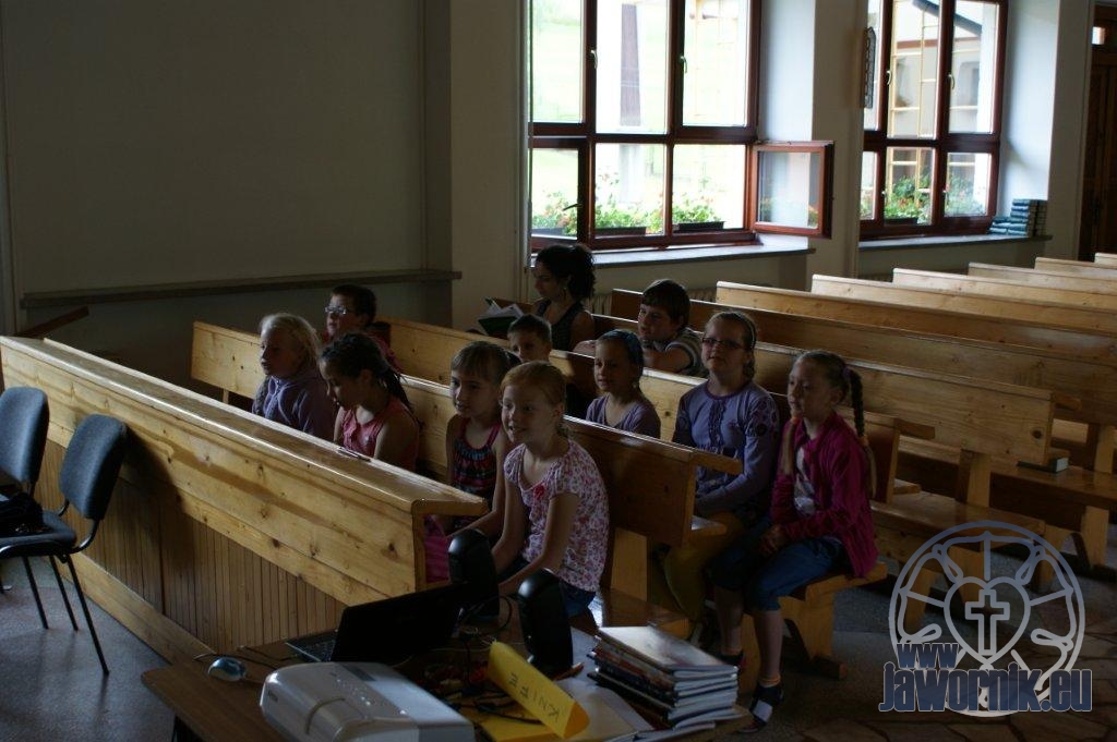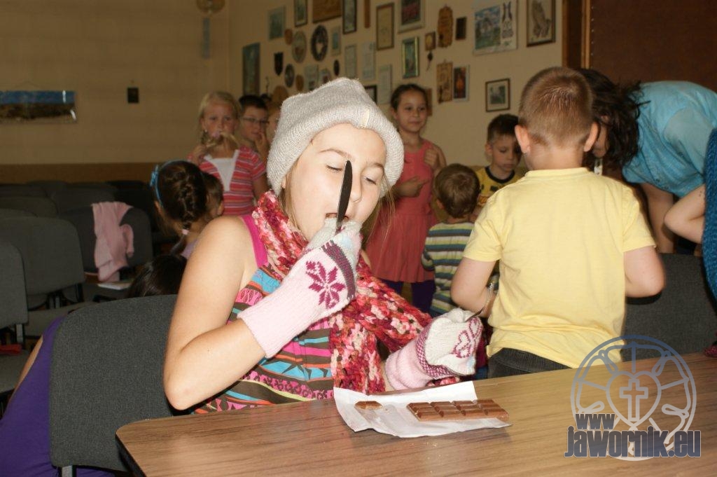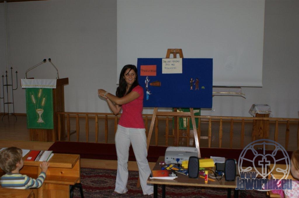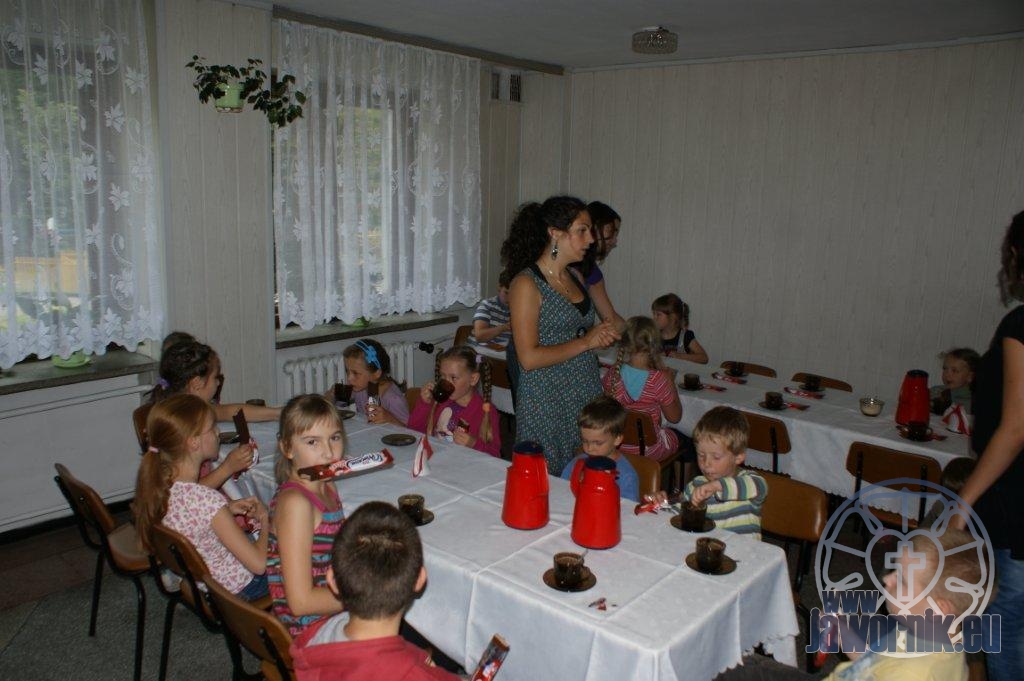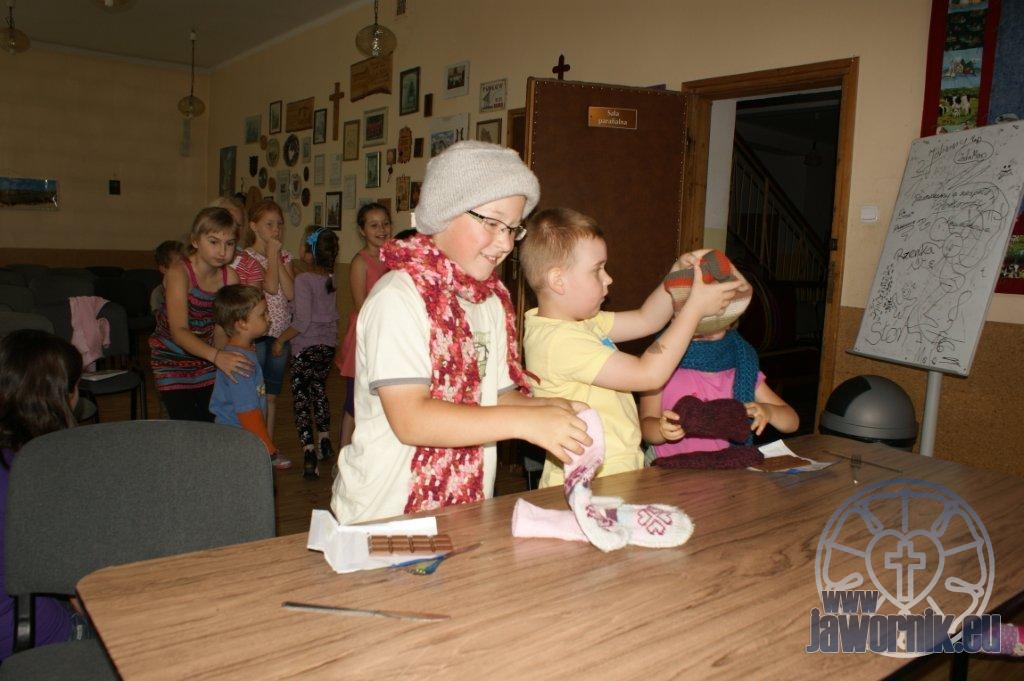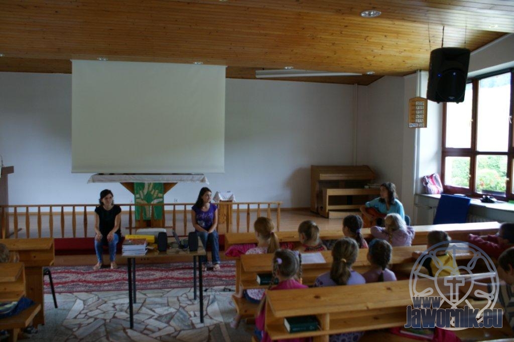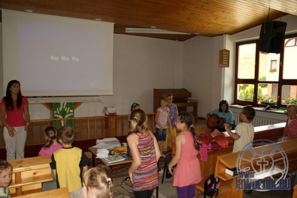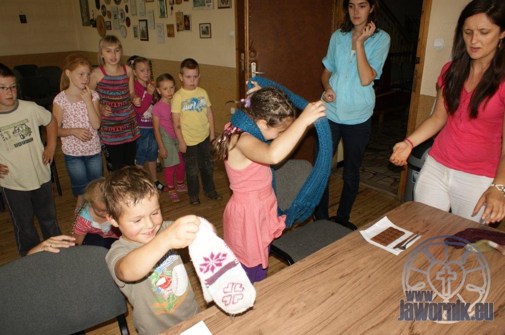 Zaczynaliśmy od wspólnego śpiewu szkółkowych piosenek. Poznaliśmy także kilka piosenek w języku angielskim. Kolejnym punktem programu była lekcja biblijna. Dzieci miały okazję nauczyć się nowych słówek, które były przewodnimi z każdej historii biblijnej. Staraliśmy się urozmaicić zajęcia i zainteresować drogich milusińskich, w szczególności tych najbardziej wymagających- najmłodszych? Na zajęcia plastyczne i naukę wersetu dzieliliśmy się na grupę starszą i młodszą. Każdego dnia poznawaliśmy werset w języku angielskim, nawiązujący do uprzednio opowiadanej historii biblijnej. Następnie schodziliśmy do jadalni na małe co nieco. Po zaspokojeniu naszych żołądków nadchodził czas długo wyczekiwany przez dzieciaki. Nie trudno się domyśleć, że chodzi o zabawy i konkursy, w których dominowała zacięta walka o zwycięstwo. Wszystko skupiało się wokół Pana Jezusa, który zarówno w języku polskim jak i angielskim jest uosobieniem niezmierzonej miłości. Zwieńczeniem całotygodniowych spotkań było niedzielne nabożeństwo, na którym dzieci miały okazję zaprezentować dwie piosenki w języku angielskim. Jako opiekunowie tegorocznej półkolonii bardzo miło będziemy wspominać czas spędzony razem i mamy nadzieję, że z Bożą pomocą spotkamy się i za rok!