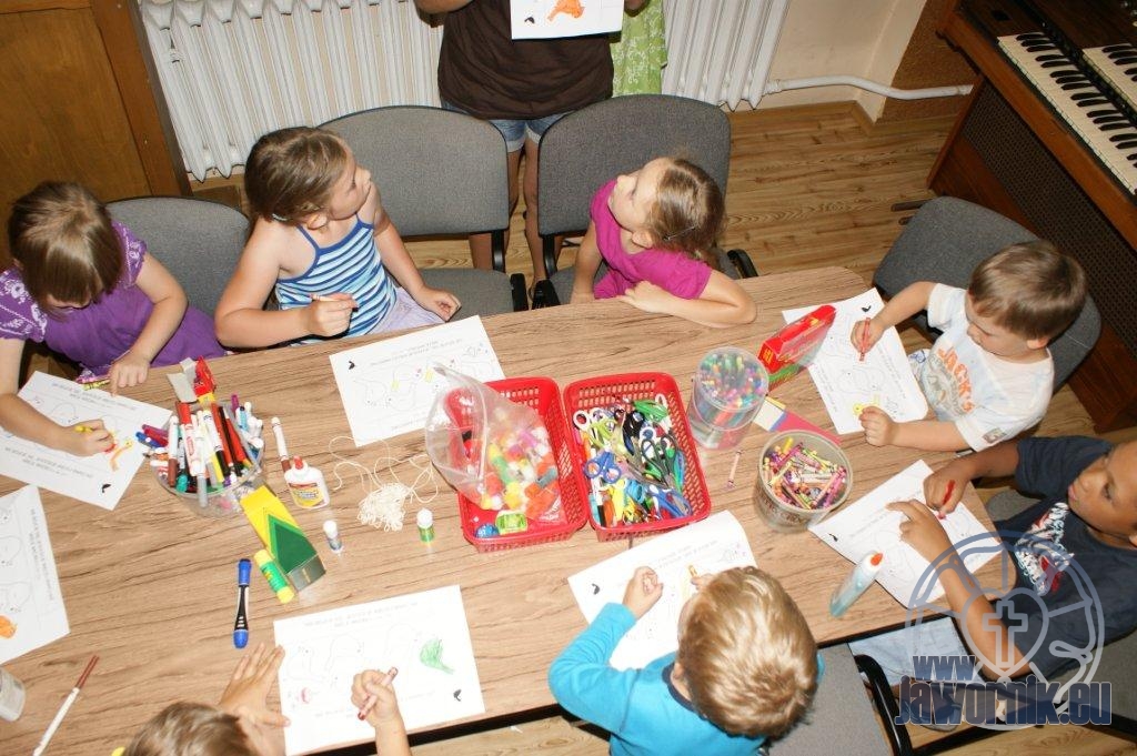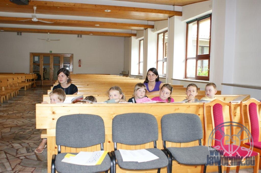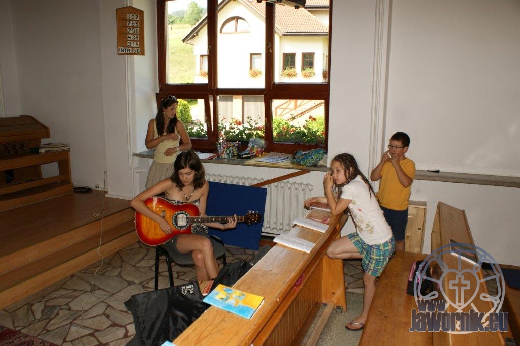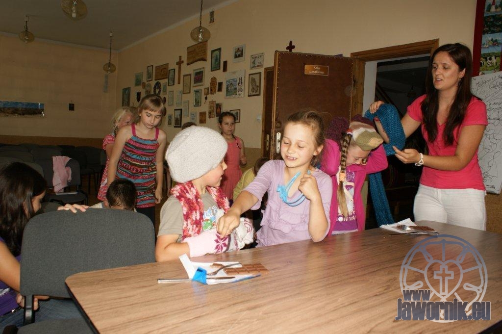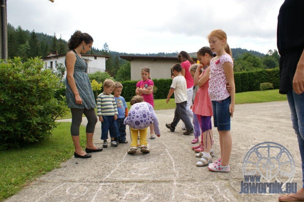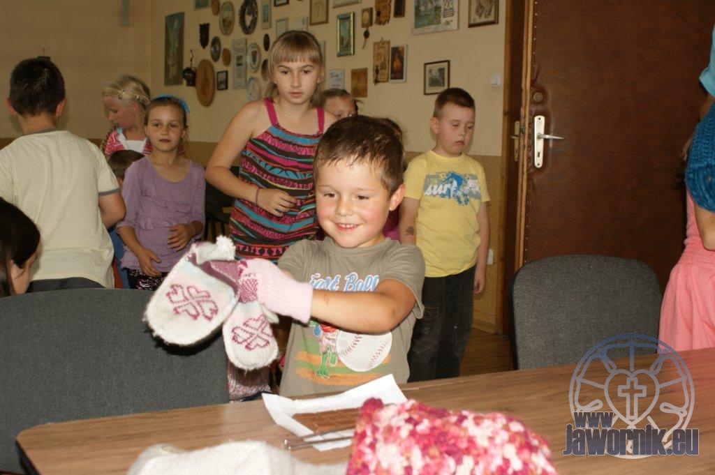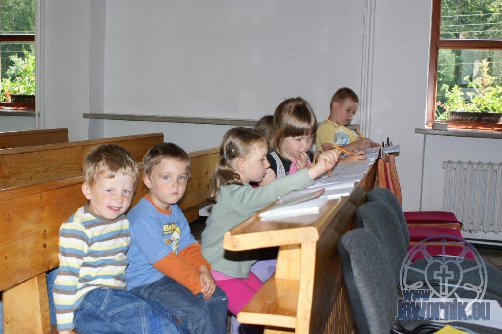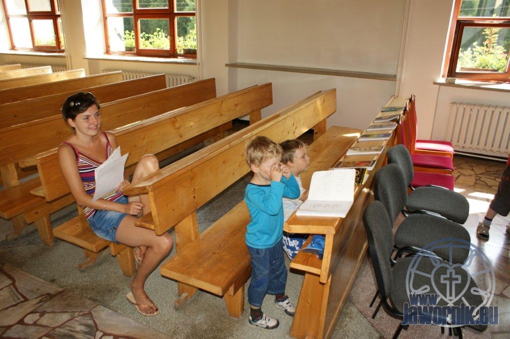 Zaczynaliśmy od wspólnego śpiewu szkółkowych piosenek. Poznaliśmy także kilka piosenek w języku angielskim. Kolejnym punktem programu była lekcja biblijna. Dzieci miały okazję nauczyć się nowych słówek, które były przewodnimi z każdej historii biblijnej. Staraliśmy się urozmaicić zajęcia i zainteresować drogich milusińskich, w szczególności tych najbardziej wymagających- najmłodszych? Na zajęcia plastyczne i naukę wersetu dzieliliśmy się na grupę starszą i młodszą. Każdego dnia poznawaliśmy werset w języku angielskim, nawiązujący do uprzednio opowiadanej historii biblijnej. Następnie schodziliśmy do jadalni na małe co nieco. Po zaspokojeniu naszych żołądków nadchodził czas długo wyczekiwany przez dzieciaki. Nie trudno się domyśleć, że chodzi o zabawy i konkursy, w których dominowała zacięta walka o zwycięstwo. Wszystko skupiało się wokół Pana Jezusa, który zarówno w języku polskim jak i angielskim jest uosobieniem niezmierzonej miłości. Zwieńczeniem całotygodniowych spotkań było niedzielne nabożeństwo, na którym dzieci miały okazję zaprezentować dwie piosenki w języku angielskim. Jako opiekunowie tegorocznej półkolonii bardzo miło będziemy wspominać czas spędzony razem i mamy nadzieję, że z Bożą pomocą spotkamy się i za rok!