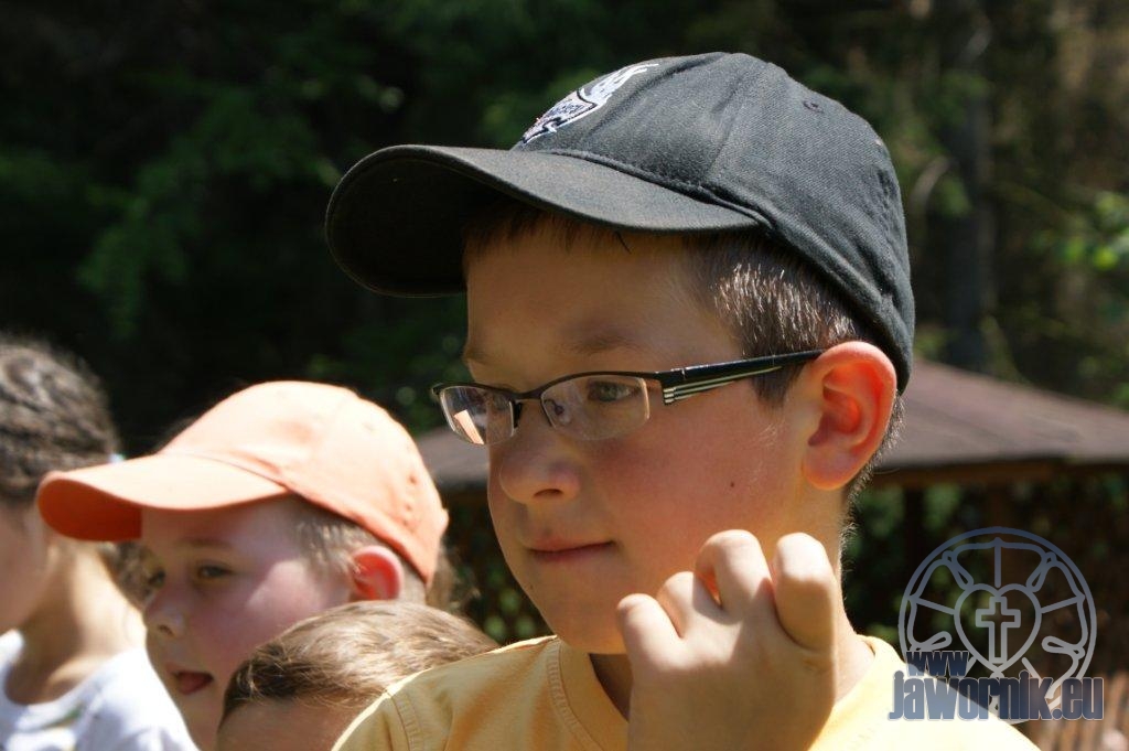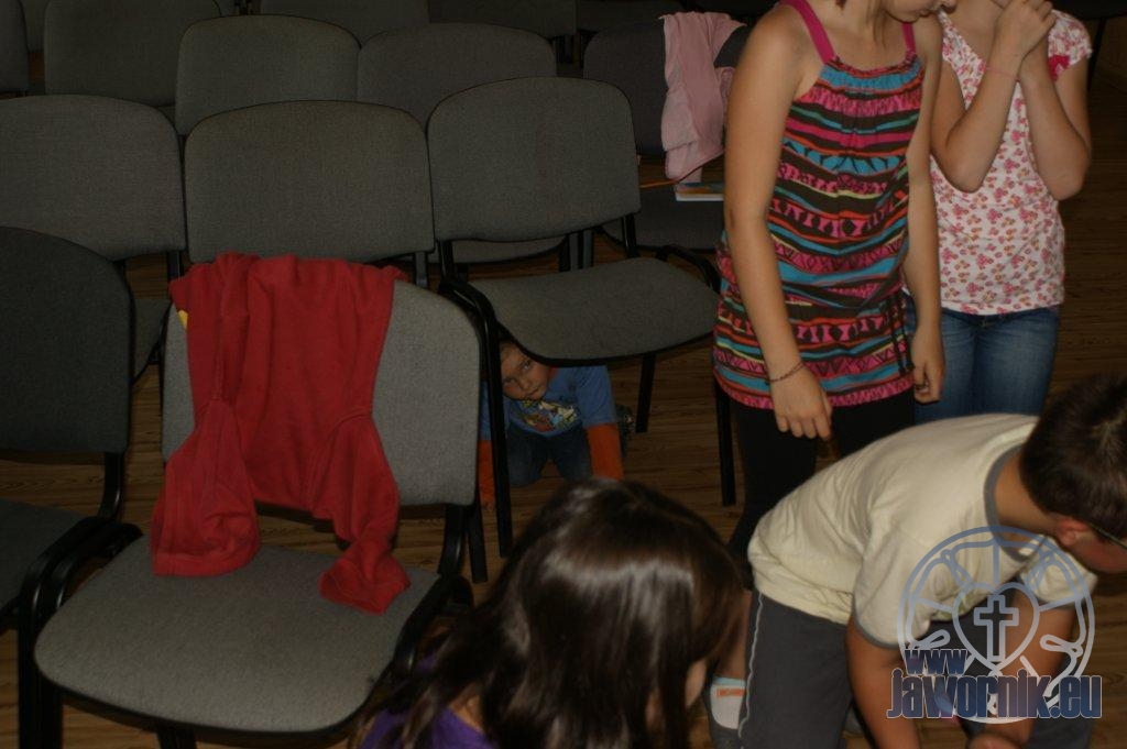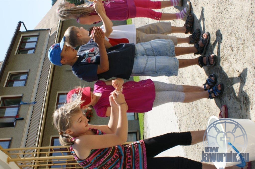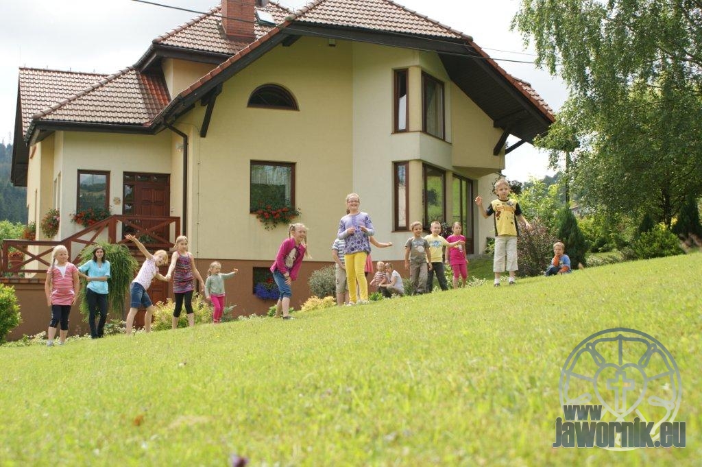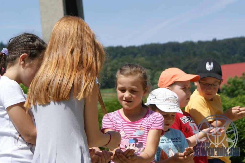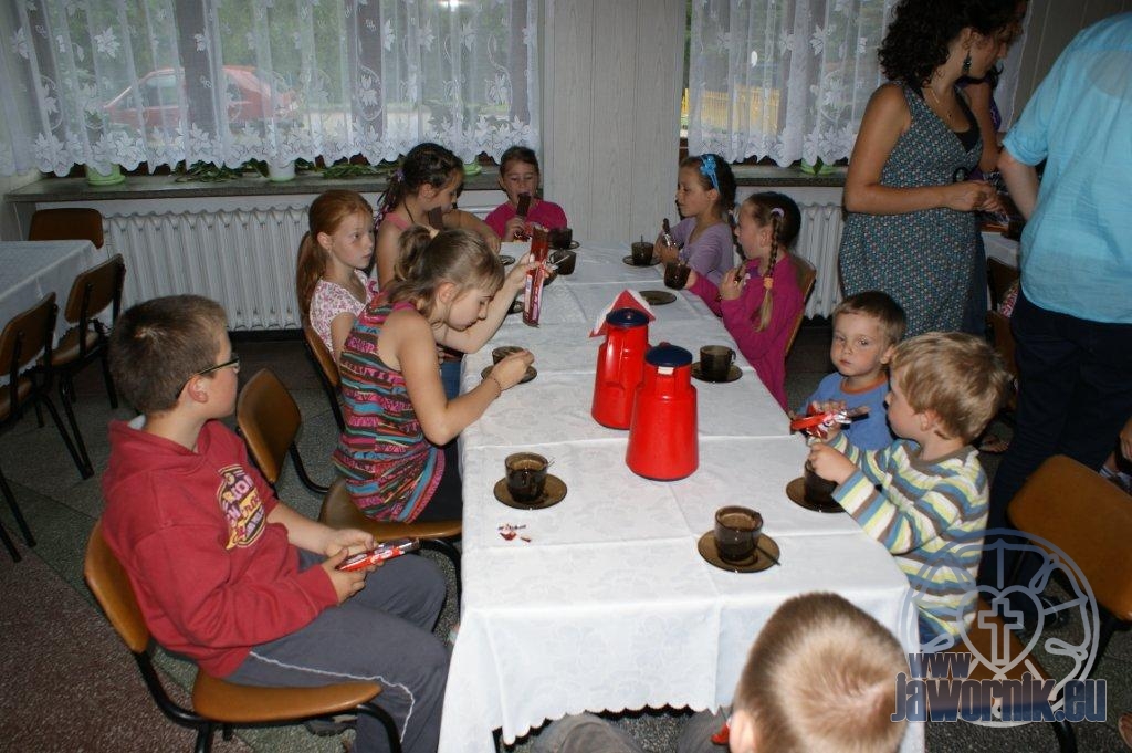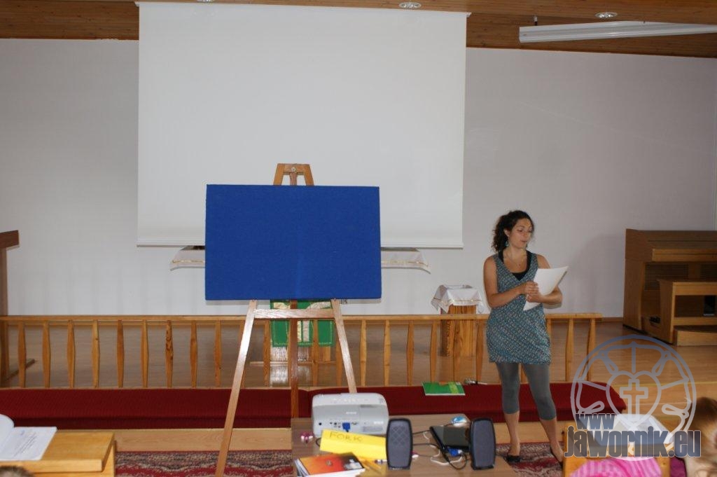 Zaczynaliśmy od wspólnego śpiewu szkółkowych piosenek. Poznaliśmy także kilka piosenek w języku angielskim. Kolejnym punktem programu była lekcja biblijna. Dzieci miały okazję nauczyć się nowych słówek, które były przewodnimi z każdej historii biblijnej. Staraliśmy się urozmaicić zajęcia i zainteresować drogich milusińskich, w szczególności tych najbardziej wymagających- najmłodszych? Na zajęcia plastyczne i naukę wersetu dzieliliśmy się na grupę starszą i młodszą. Każdego dnia poznawaliśmy werset w języku angielskim, nawiązujący do uprzednio opowiadanej historii biblijnej. Następnie schodziliśmy do jadalni na małe co nieco. Po zaspokojeniu naszych żołądków nadchodził czas długo wyczekiwany przez dzieciaki. Nie trudno się domyśleć, że chodzi o zabawy i konkursy, w których dominowała zacięta walka o zwycięstwo. Wszystko skupiało się wokół Pana Jezusa, który zarówno w języku polskim jak i angielskim jest uosobieniem niezmierzonej miłości. Zwieńczeniem całotygodniowych spotkań było niedzielne nabożeństwo, na którym dzieci miały okazję zaprezentować dwie piosenki w języku angielskim. Jako opiekunowie tegorocznej półkolonii bardzo miło będziemy wspominać czas spędzony razem i mamy nadzieję, że z Bożą pomocą spotkamy się i za rok!