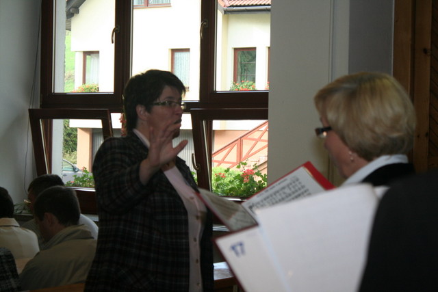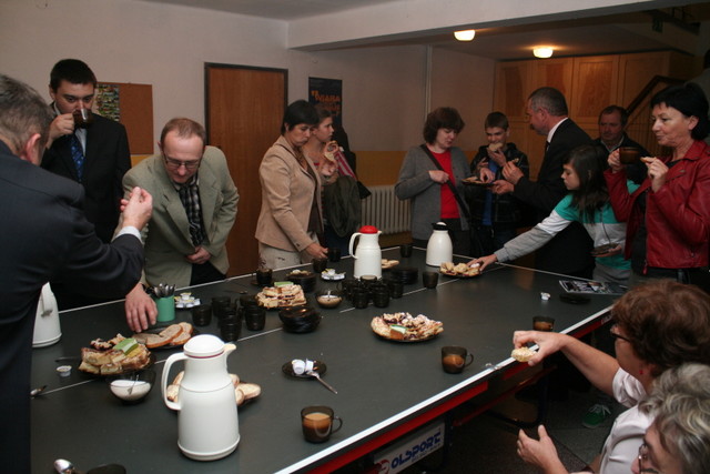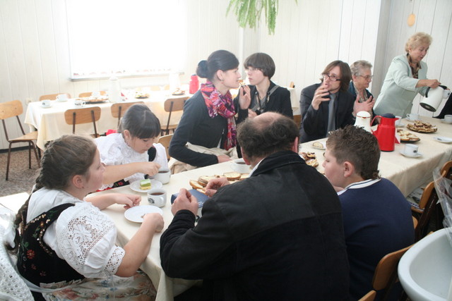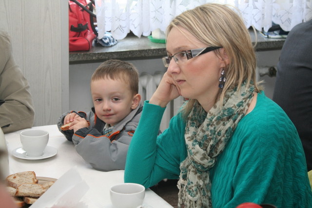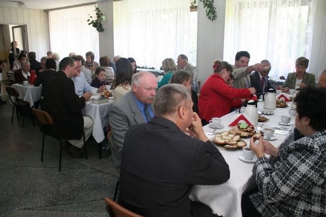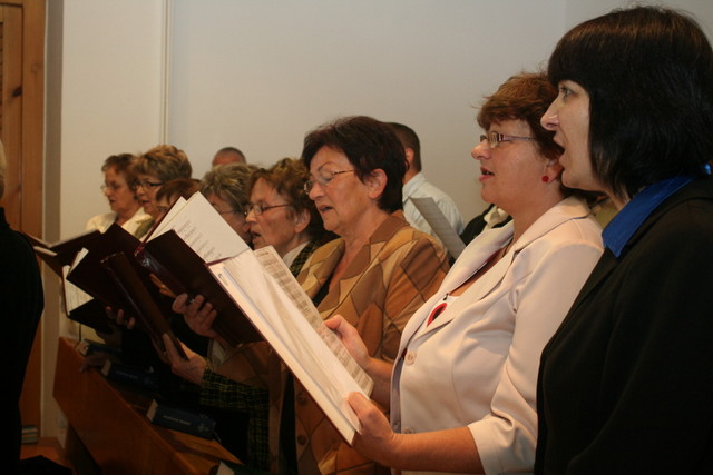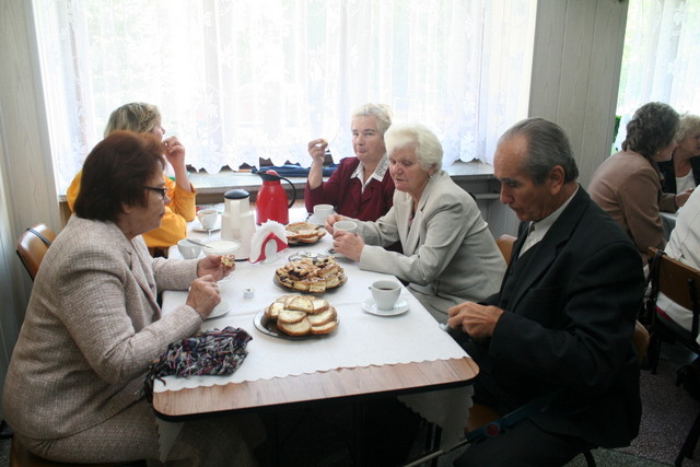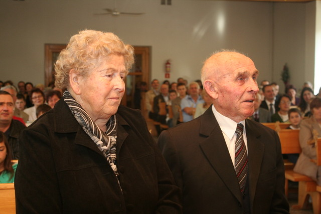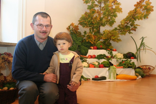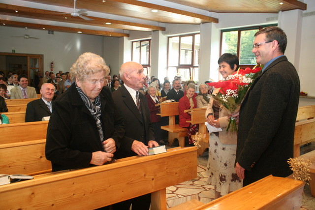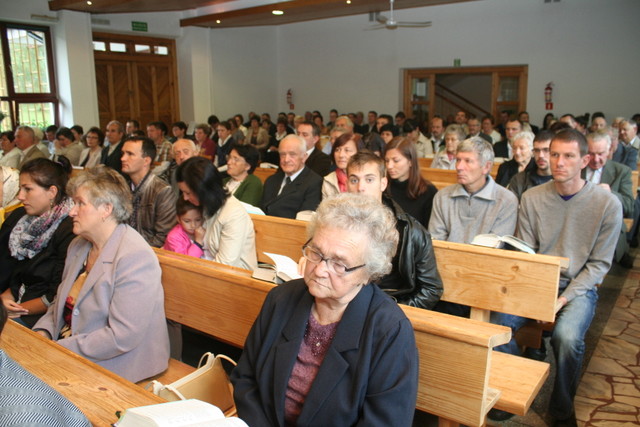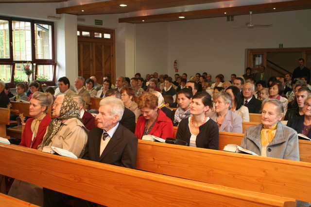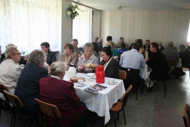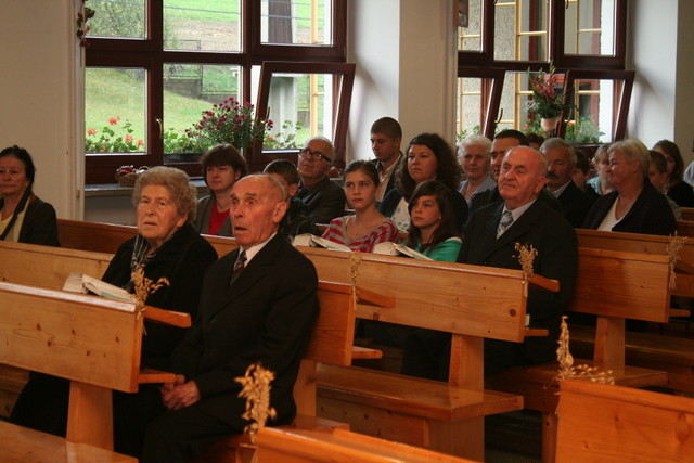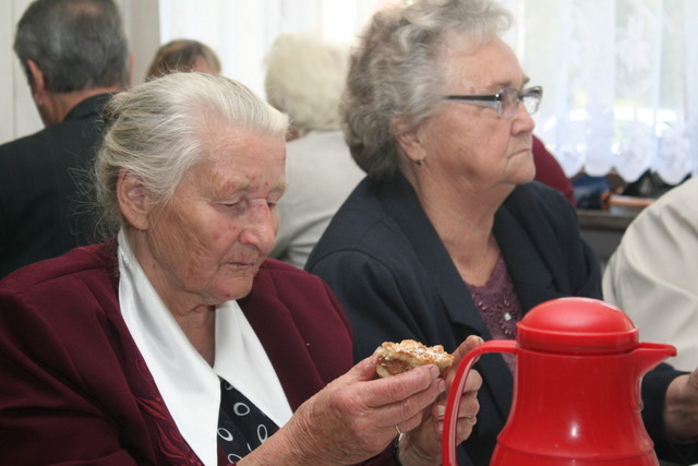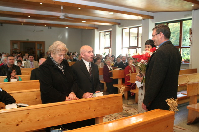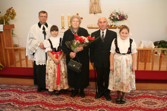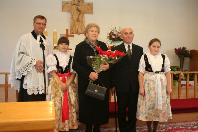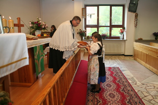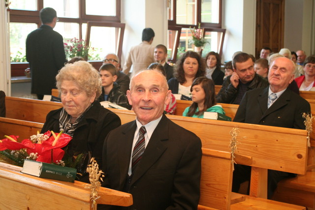 To właśnie bochen codziennego daru rodzący się z trudu pracy rolnika został wniesiony przez dziewczynki w regionalnych strojach, aby został pobłogosławiony. Wyjątkowość nabożeństwa polegała na tym, że ołtarz był pięknie przyozdobiony darami natury, czyli warzywami, owocami i kwiatami. Mieliśmy jeszcze jeden powód do wdzięczności. Państwo Anna i Bolesław Białostoccy obchodzili jubileusz 65-lecia pożycia małżeńskiego. Razem z jubilatami dziękowaliśmy Bogu za opiekę, prowadzenie i wszelkie dowody Jego błogosławieństwa. Nabożeństwo swoimi pieśniami uświetnił chór parafialny, który jedną ze swoich pieśni zadedykował naszym jubilatom. Po nabożeństwie parafianie mogli spotkać się przy kawie, herbacie i wypiekach. Można było również degustować świeży chleb posmarowany domowym masłem i smalcem, pamiętając jednocześnie o tym, że najlepszym podziękowaniem jest dzielona kromka chleba z innymi. W tym miejscu dziękujemy tym wszystkim, którzy przynieśli dary, przygotowali wypieki oraz przystroili naszą kaplicę.