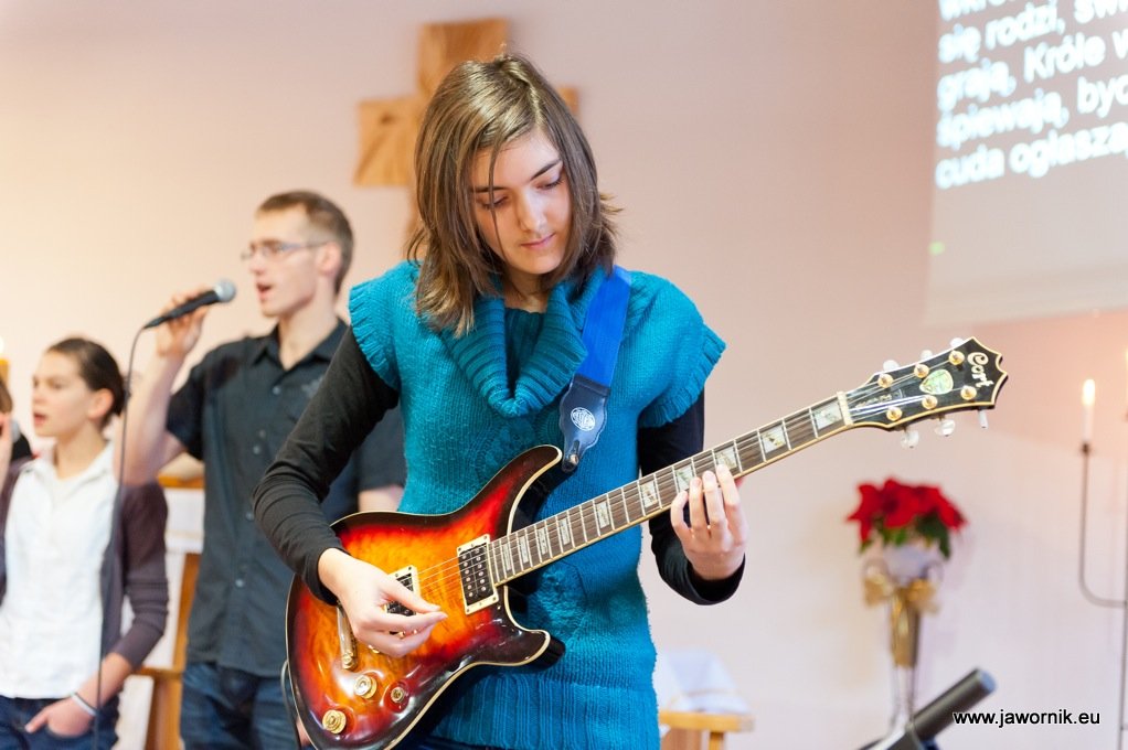 Wieczorne nabożeństwo wigilijne o godzinie 22 zostało uświetnione przez śpiew zespołu i chóru, na instrumentach zagrała Karolina - flet i Marzena - skrzypce, a kazanie wygłosił student teologii Piotr Sztwiertnia, który zastanawiał się, dlaczego świętujemy, co sprawia, że tak licznie gromadzimy się na świątecznych nabożeństwach i zachęcał do szczerej radości z powodu tego, że Chrystus przyszedł na świat.