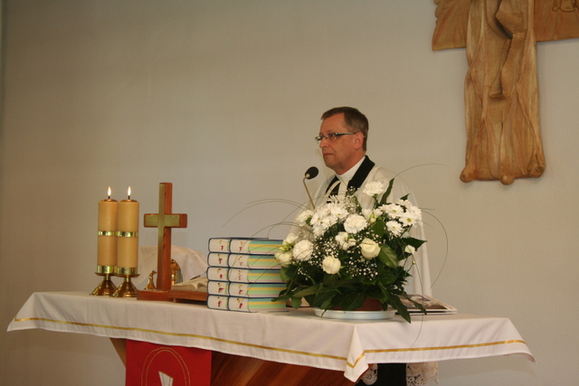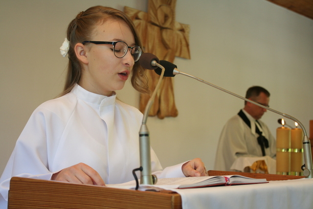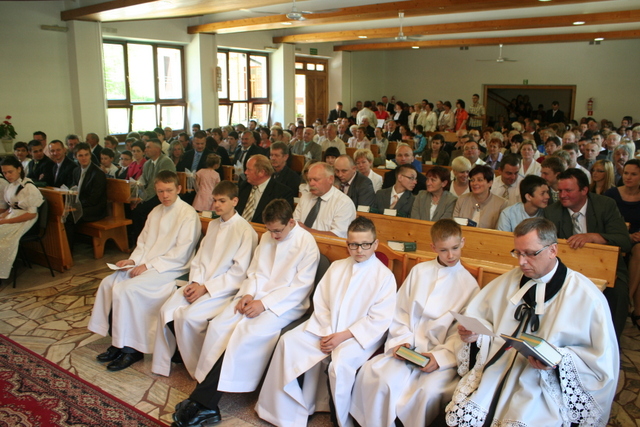 W trakcie niedzielnej uroczystości ks. Z. Sztwiertnia przywitał wszystkich zgromadzonych, następnie poprowadził liturgię i wygłosił kazanie. Mówił o tym, jak ważne jest, abyśmy swoim dzieciom dawali dobry przykład, wskazując na Pana Jezusa, mimo że przeżywamy nieraz chwile zwątpienia i rozczarowania, podobnie jak starotestamentowy Mojżesz. Wiedząc, że sam nie da sobie rady, ratunku szukał u swojego Pana.