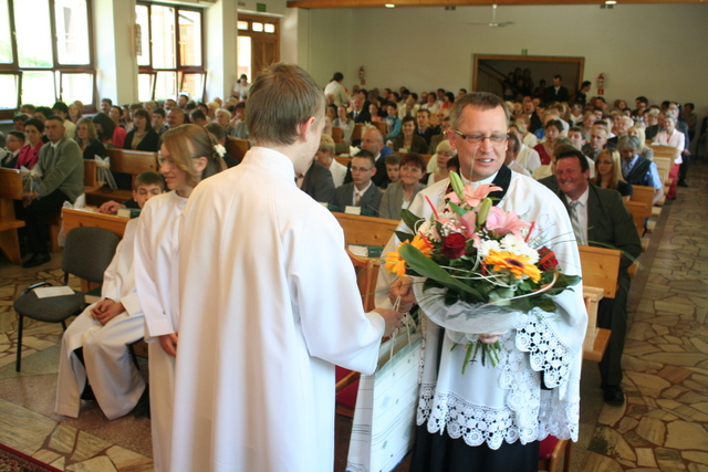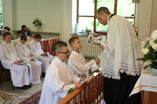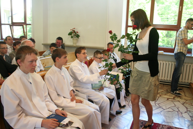 W trakcie nabożeństwa młodzież podziękowała za naukę i opiekę ks. Zdzisławowi Sztwiertni. Wręczyli kwiaty i upominek. O oprawę muzyczną uroczystości zadbał parafialny chór mieszany.