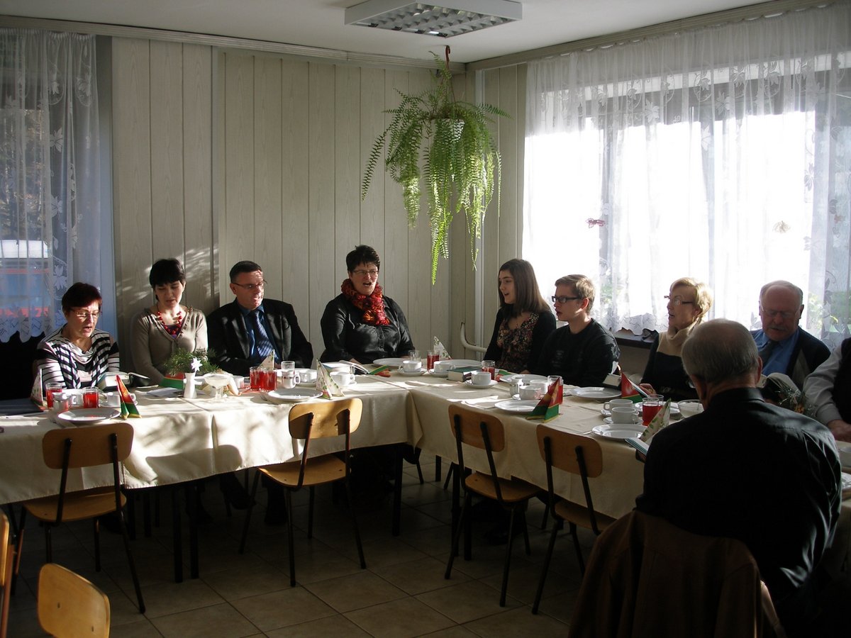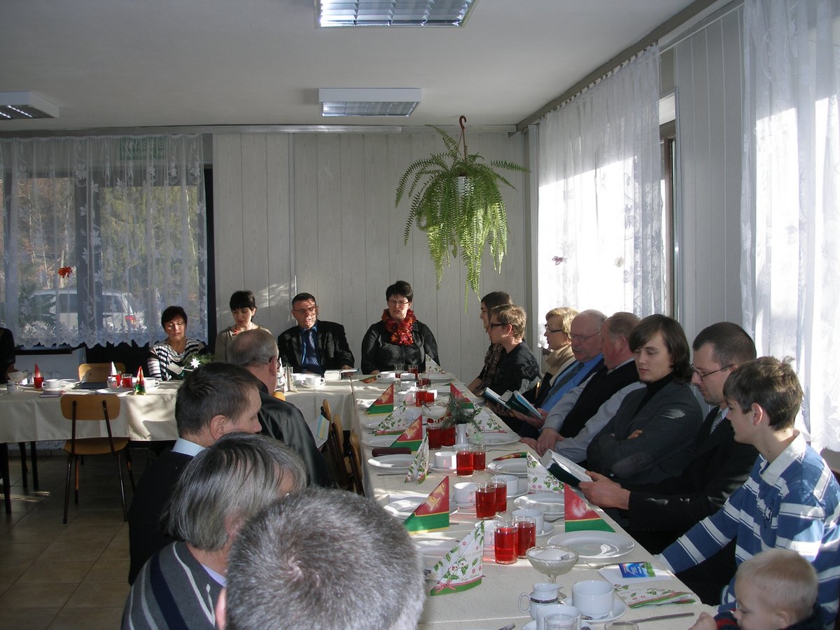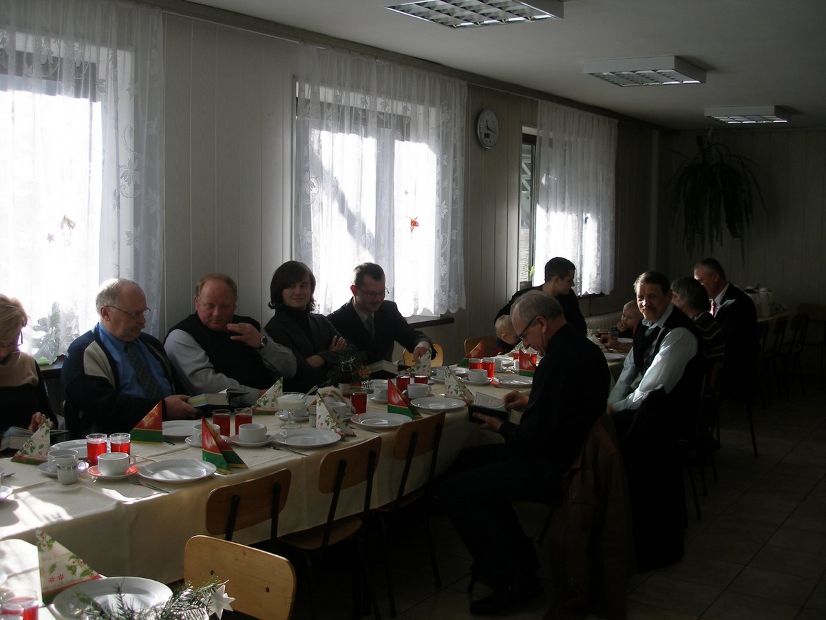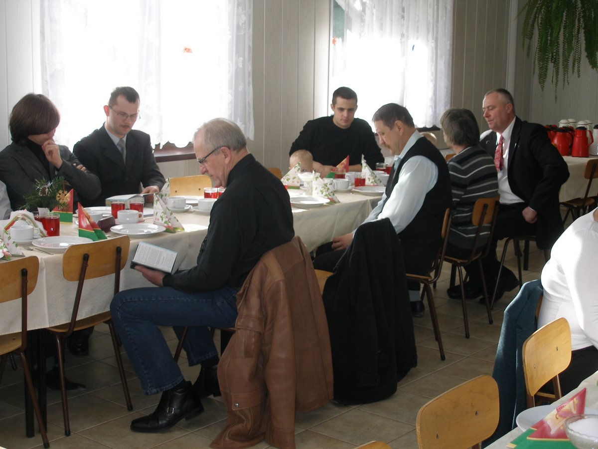 Spotkanie to było okazją do spojrzenia na miniony rok, a także do podzielenia się spostrzeżeniami dotyczącymi różnych płaszczyzn służby w naszej Parafii. Przy zastawionych stołach w świątecznej atmosferze był czas na kolędowanie. Podczas tego spotkania ks. proboszcz podziękował obecnym.za ich pełną poświęcenia służbę dla Parafii. Wolontariuszom Parafii wręczono jako podziękowanie talony do zrealizowania w drogerii "Alicja". W czasie tego spotkania głoś zabrał prezes naszego chóru Zbigniew Czyż, który nawiązał do jubileuszu 30 rocznicy poświęcenia Domu Katechetycznego. Przypomniał, że w bieżącym roku nasz chór przygotowuje się do jubileuszu 30 lat śpiewania na chwałę Bogu. Na zakończenie spotkania wszyscy obecni zostali obdarowani książeczką: "Gdzie jest nasze Betlejem" autorstwa Lidii Czyż.