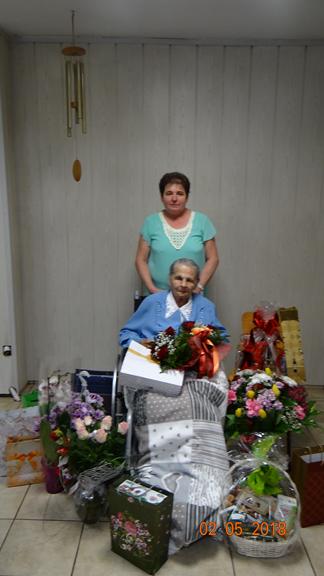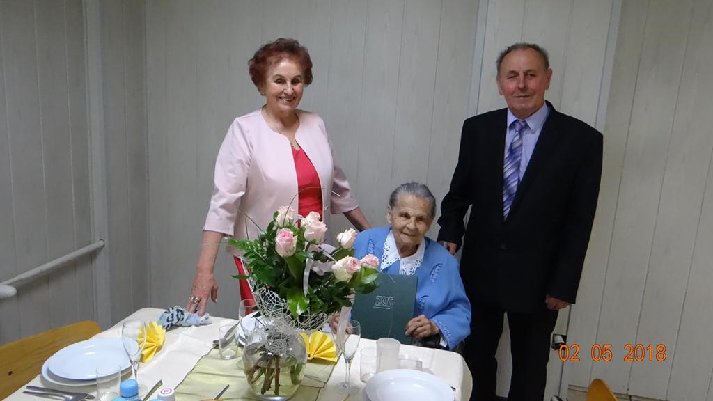 Nie zabrakło przedstawicielki Zakładu Ubezpieczeń Społecznych. W przeżywaniu tej wzniosłej chwili uczestniczyły córki Jubilatki z gronem wnucząt, prawnucząt i praprawnucząt wraz z rodzinami. Słowa modlitwy ks. Zdzisława Sztwiertni za 100 lat Bożej opieki oraz wspólnie wykonana pieśń "Aż dotąd prowadził mnie Bóg" wycisnęły łzy wzruszenia w oczach Jubilatki oraz zgromadzonych gości. Drogiej Jubilatce życzyliśmy kolejnych lat w dobrym zdrowiu, pod bezpiecznymi Ojcowskimi skrzydłami, w towarzystwie życzliwej córki Emilii z mężem Andrzejem, którzy na co dzień opiekują się sędziwą mama i babcią. Niechaj dobry Bóg nadal ją chroni w zagłębieniu swoich dłoni. Dzień ten był szczególny również dlatego, że wnuczka naszej jubilatki p. Danuta Bujok obchodziła jubileusz 60 – lecia urodzin. Zacnym jubilatkom: Ad multos annos.
