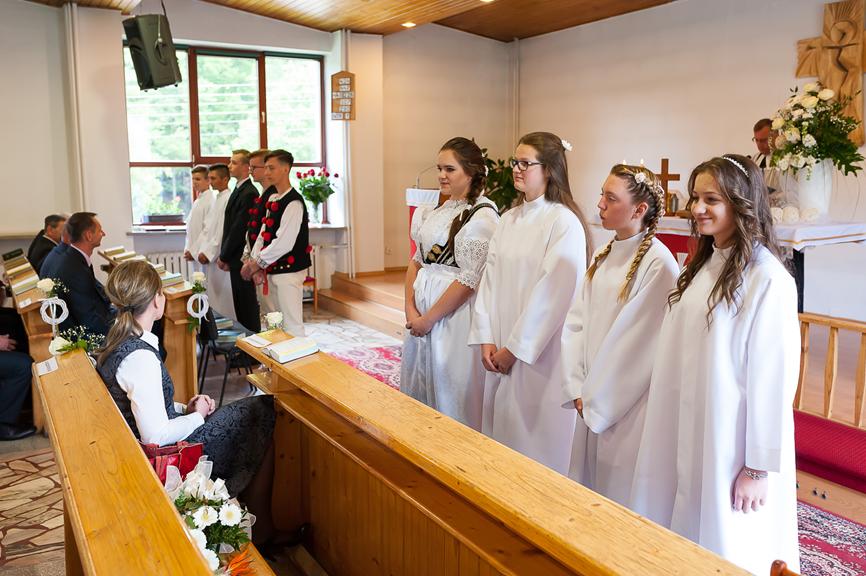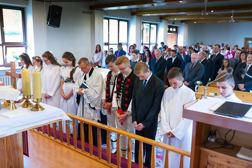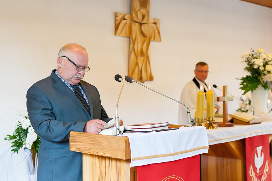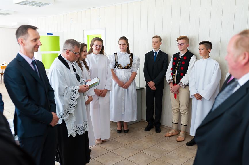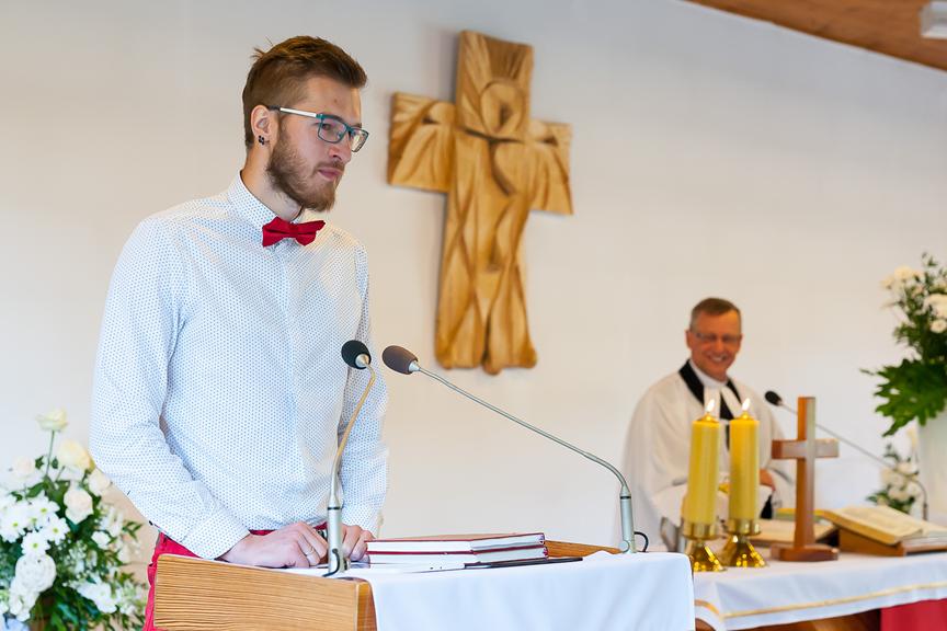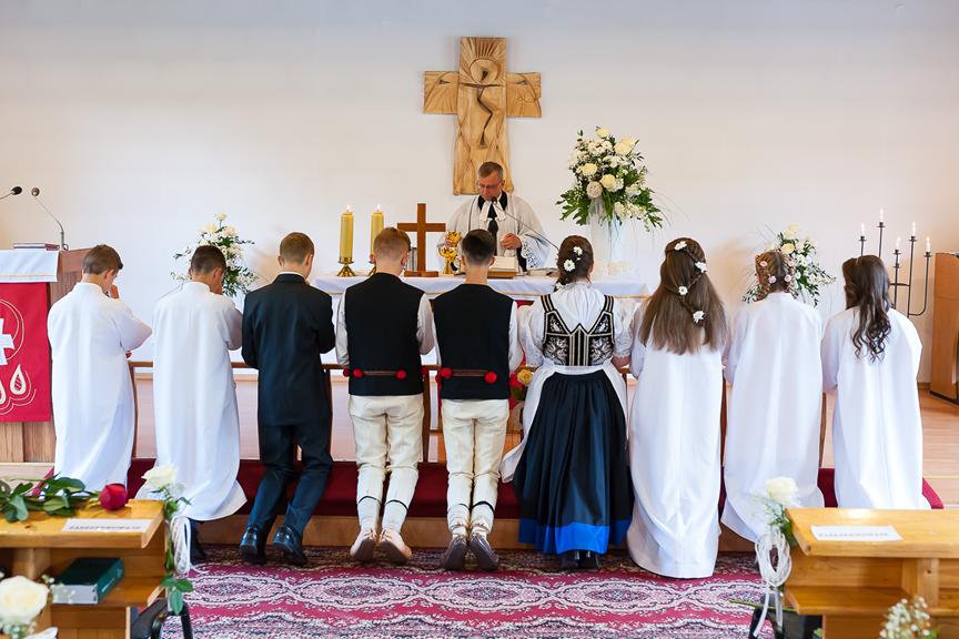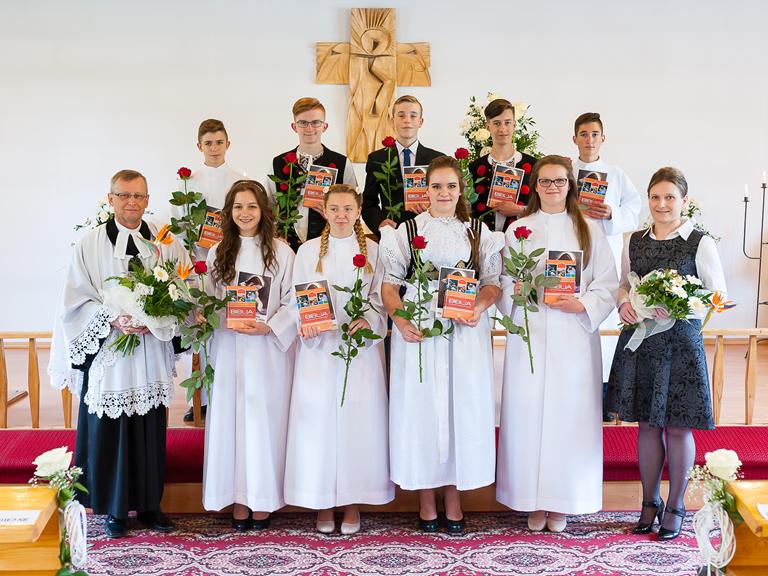 20 maja 2018 niedzielne nabożeństwo w Święto Zesłania Ducha Świętego miało charakter szczególny, gdyż podczas tej uroczystości 9 młodych parafian przystąpiło do konfirmacji. Zanim jednak do tego doszło, w święto Wniebowstąpienia Pańskiego (10 maja) odbył się tradycyjnie już egzamin przeprowadzony przez ks. Zdzisława Sztwiertnię. Egzamin ten stanowił przypomnienie prawd poznanych przez dwa lata nauki przedkonfirmacyjnej, a dokładnie dotyczył Modlitwy Pańskiej. Nabożeństwo rozpoczęło się od procesjonalnego wejścia Rady Parafialnej, księdza, katechetki i konfirmantów do kościoła.